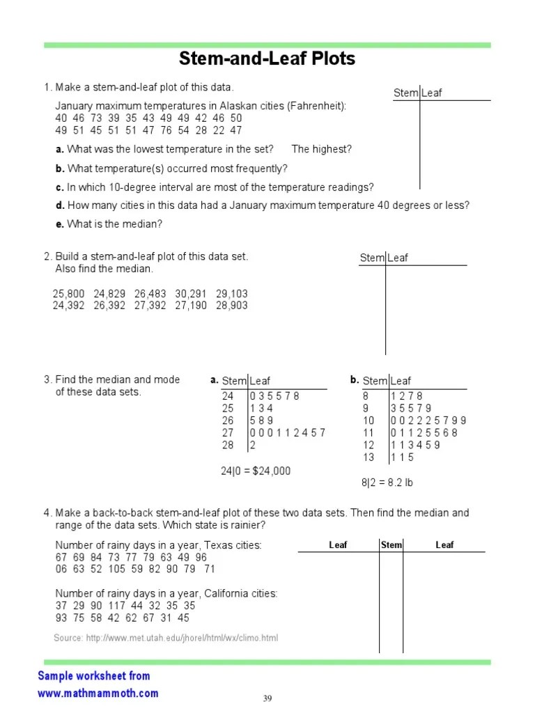 Word problems are also included. Grab some of these worksheets for … Stem represents the first digits of the data points; A stem and leaf plot shows the spread and distribution of a data set. These printable exercises cater to the learning requirements of students of grade 6 through high school.